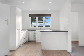 Kitchen has good storage space, stove and dishwasher with views overlooking rural farmland out to the Alps.