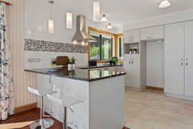 The modern kitchen boats a stone bench top, breakfast bar, and pendant lighting. A tiled splash back runs the length of the kitchen and a corner window ensures plenty of natural light fills the space.