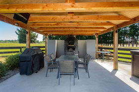 Outside, within the post and rail fencing is a grand entertaining suite comprising pizza oven, open fire, spa (negotiable) and outdoor TV all under a gazebo - this is an amazing area.