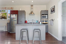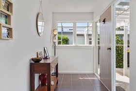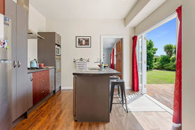 Sunny, spacious open plan living area with an effortless flow out French doors to a sheltered deck overlooking a mature garden setting.